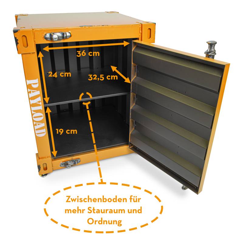 Hinter der Container-Tür befindet sich ein Fach, welches durch einen herausnehmbaren Boden geteilt wird.