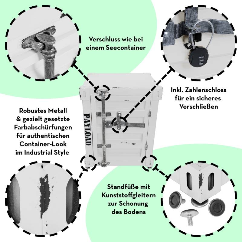 Das Möbelstück besteht komplett aus Metall und ist einfarbig. Die Verschlüsse sind in einem silber "used-look" gehalten.