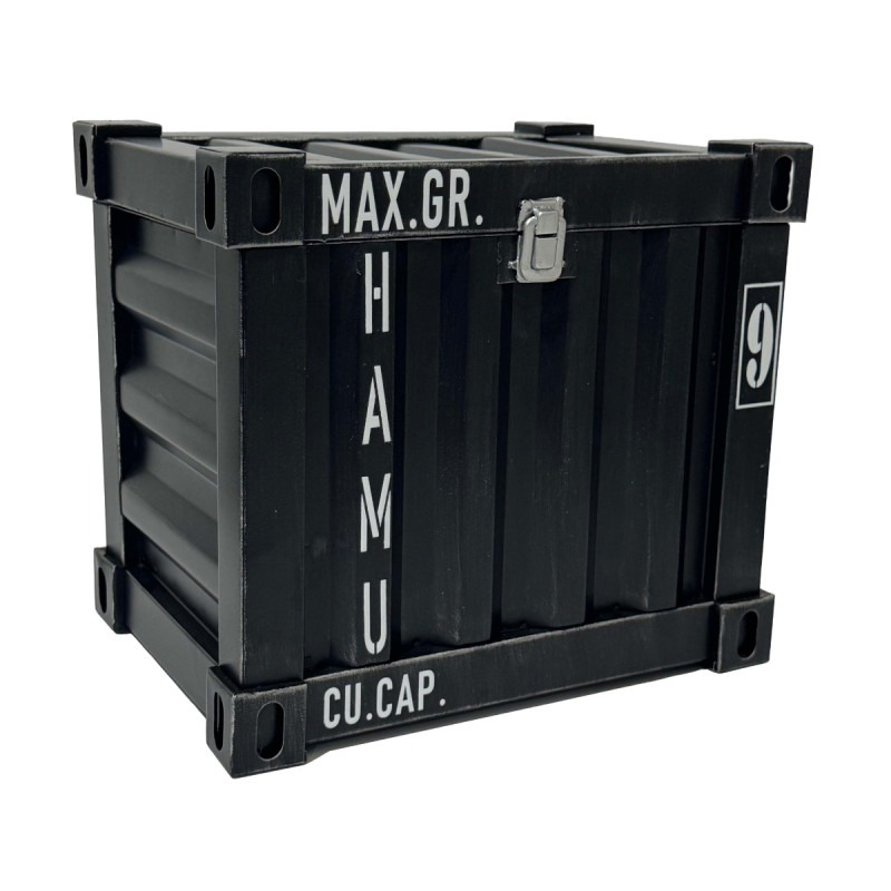 Das elegante schwarze Design wird durch einen silberfarbenen Verschluss abgerundet – ein detailverliebtes Highlight, das die Optik noch authentischer macht. Auf der Vorderseite finden sich die typischen Merkmale eines Frachtcontainers wieder, wie man es von echten Handelsschiffen aus dem Hafen kennt. Somit ist diese Truhe ein echtes Statement für alle Liebhaber des maritimen Flairs und Fans moderner Industrie-Ästhetik.