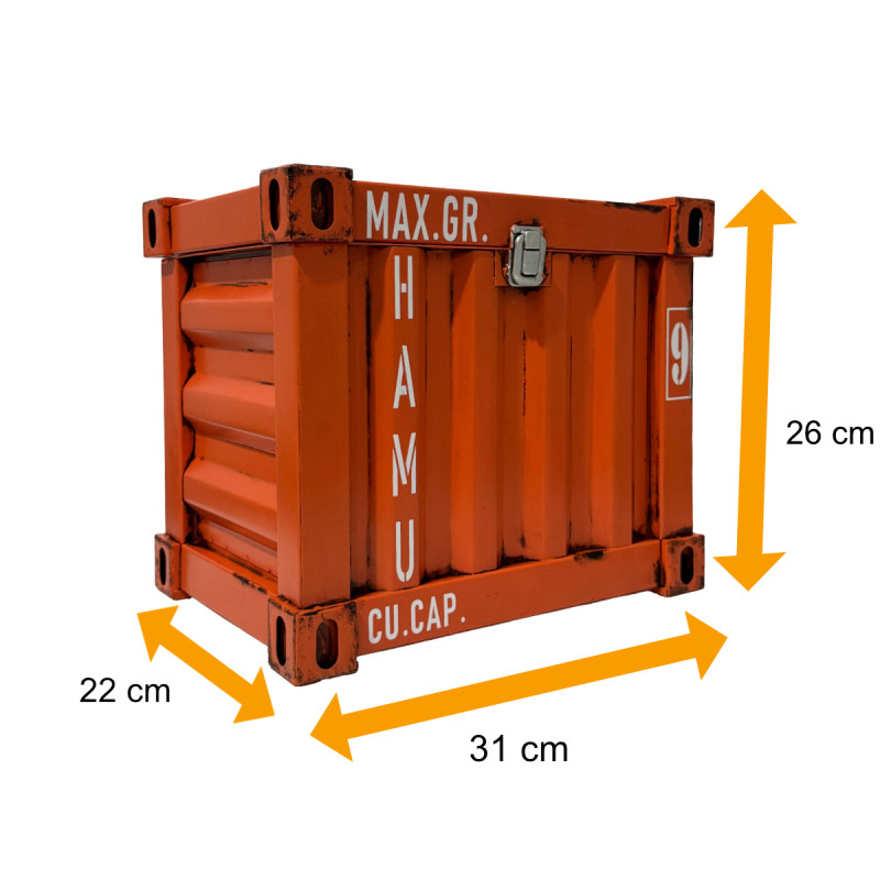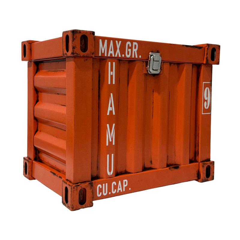 Das elegante orange Design wird durch einen silberfarbenen Verschluss abgerundet – ein detailverliebtes Highlight, das die Optik noch authentischer macht. Auf der Vorderseite finden sich die typischen Merkmale eines Frachtcontainers wieder, wie man es von echten Handelsschiffen aus dem Hafen kennt. Somit ist diese Truhe ein echtes Statement für alle Liebhaber des maritimen Flairs und Fans moderner Industrie-Ästhetik.