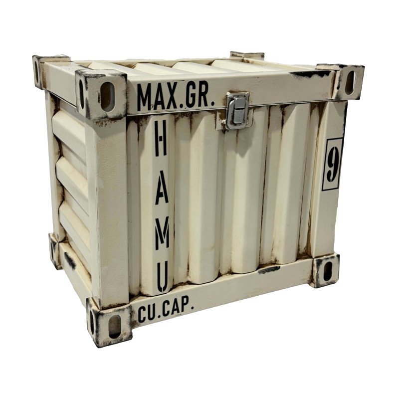 Das elegante weiße Design wird durch einen silberfarbenen Verschluss abgerundet – ein detailverliebtes Highlight, das die Optik noch authentischer macht. Auf der Vorderseite finden sich die typischen Merkmale eines Frachtcontainers wieder, wie man es von echten Handelsschiffen aus dem Hafen kennt. Somit ist diese Truhe ein echtes Statement für alle Liebhaber des maritimen Flairs und Fans moderner Industrie-Ästhetik.