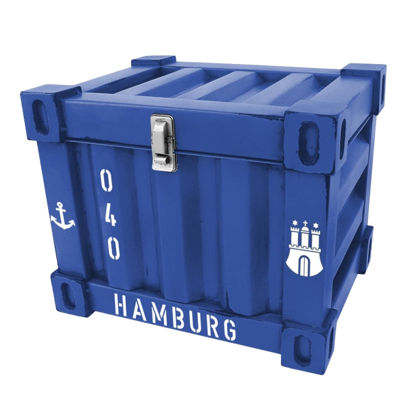 Diese hochwertige Truhe im Containerlook bringt echtes Hafen-Feeling in Ihr Zuhause. Im blauen Design mit silberfarbenem Verschluss überzeugt sie durch ihre detailverliebte Optik im Industrie- und Container-Stil. Das markante Hamburg Logo sowie die Container-Nummer mit Hamburger Vorwahl machen sie zu einem besonderen Highlight für alle Fans der Hansestadt.